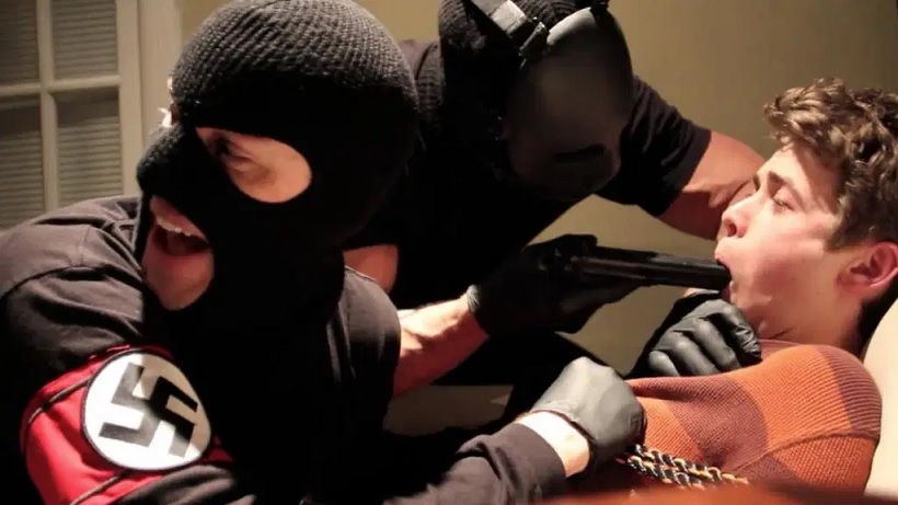 We have some pretty shocking scenery in this film, the two most shocking being the surprising death of a character early on and one of the male children being forced to rape his mother. There’s an eye-gouging in there too, along with a swastika being burned into a boy’s cheek, but the two scenes I mentioned before strike me as far more brutal. Really, there’s not much going on here – the break-in happens literally two minutes into the movie, and from there on out, it’s a bloodbath.