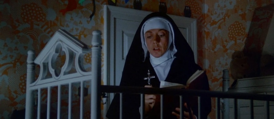 Of anyone, Donald Pleasence was the nicest to see. He didn’t have the biggest role, but I enjoyed his screen presence, especially his conversations with Eileen Atkins, who was my second favorite here. I don’t know the actress, but for a nun, I found her fun. This isn’t to take away from Joan Collins (Tales from the Crypt), who did a pretty good job, or Hilary Mason (Dolls and Meridian), but Pleasence and Atkins stood out the most.